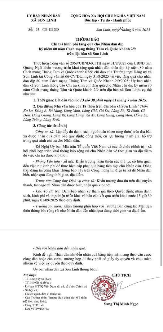 Thứ hai, 01/09/2025 | 11:40 A- A A+ | Thông báo chi trả kinh phí tặng quà cho Nhân dân dịp kỷ niệm 80 năm Cách mạng tháng Tám và Quốc khánh 02/9 trên địa bàn xã Sơn Linh Giọng nữ miền Bắc Giọng nam miền Bắc Giọng nữ miền Nam Đọc bài Chia sẻ Lưu File đính kèm: